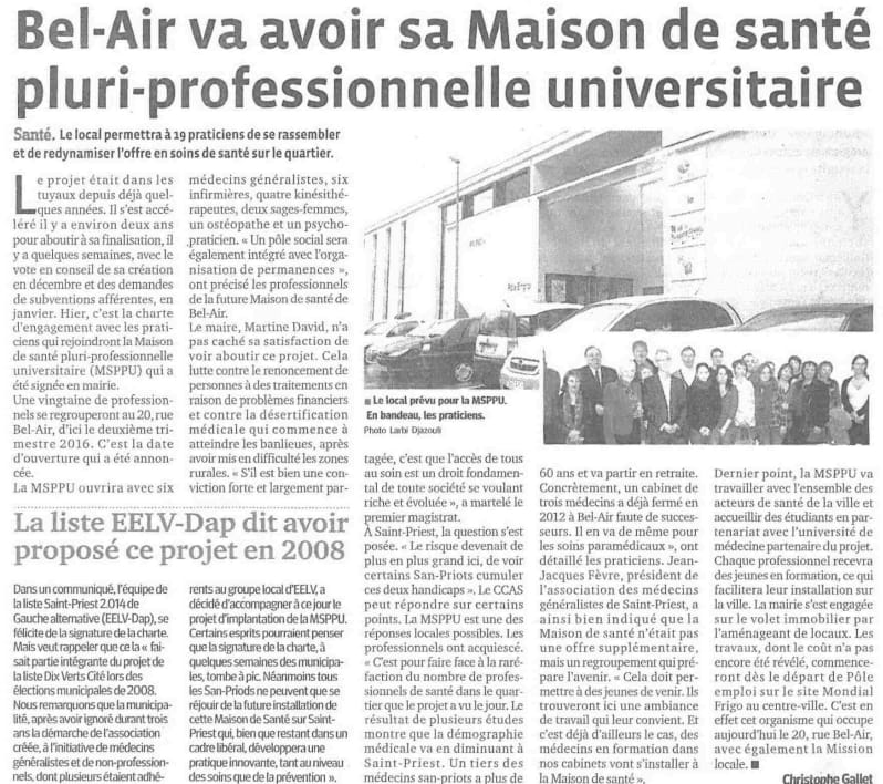 - Dans cet article du Progrès daté de 2014, il est clairement indiqué que le projet de MSPU a été initié et porté par l’exécutif de gauche bien avant l’arrivée de M Gascon aux manettes. L’article indique même que « le projet est dans les tuyaux depuis quelques années » et que les écologistes ont portés ce projet dès 2008.